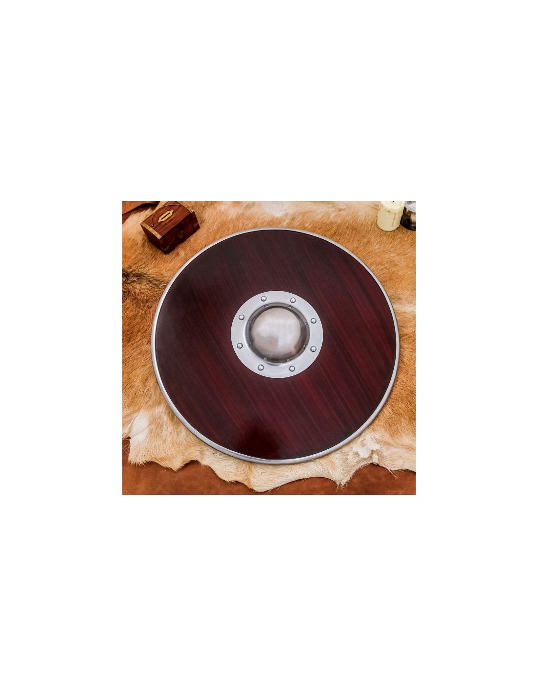Este escudo, de aprox. O diâmetro de 21,5 polegadas é meticulosamente feito à mão de MADEIRA GENUÍNA. Para um aperto firme, este escudo tem uma alça de couro ajustável e uma alça de metal reforçada com madeira. O umbo e os acessórios também são feitos de AÇO SUAVE resistente. Este escudo é totalmente funcional e um ajuste perfeito para reconstituições, bem como decoração.