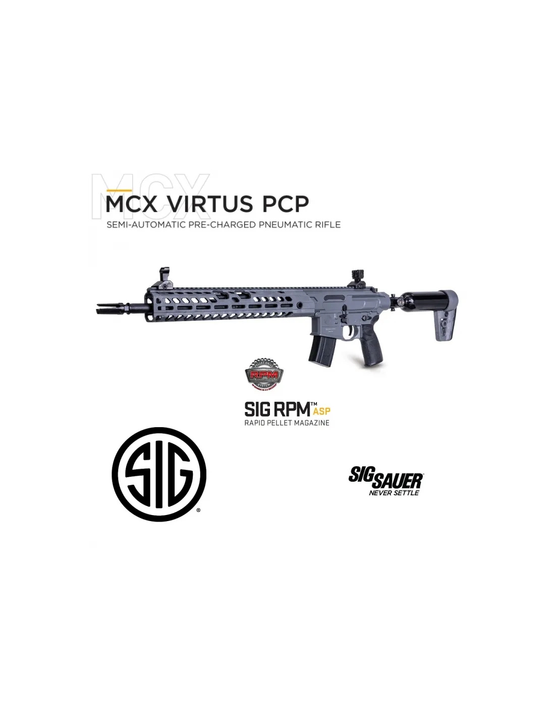 A carabina MCX VIRTUS PCP é a mais recente adição à linha de pistolas e carabinas de ar de precisão da SIG AIR. Esta metralhadora, semi automática, funciona com uma botija PCP que permite disparar até aprox. 150 disparos, até ser novamente recarregada de ar. O seu carregador permite colocar até 30 chumbos.
